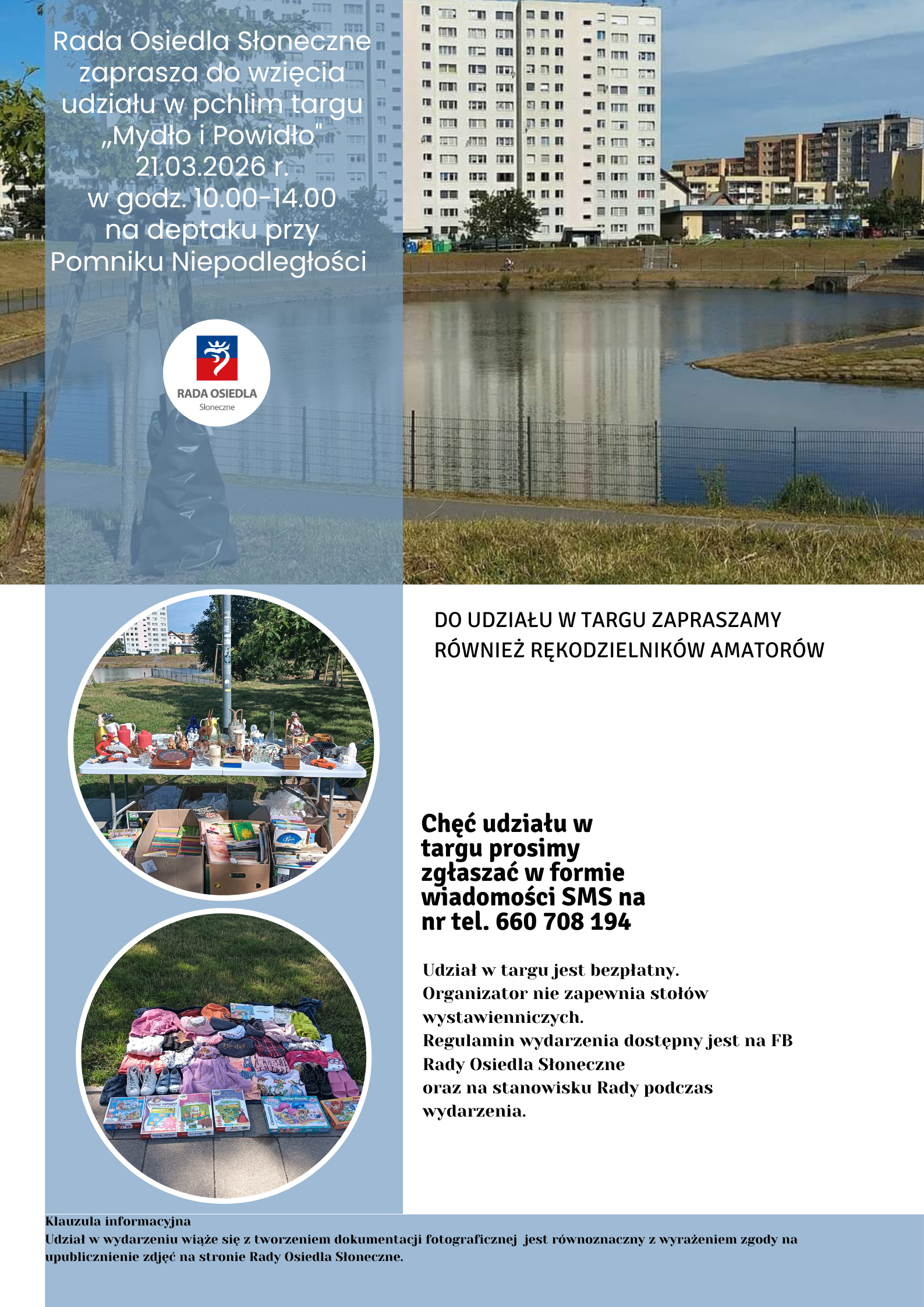 Od 21.03.2023 do 19.09.2026 Rada organizuje comiesięczny Targ Osiedlowy "Mydło i Powidło".W załaczeniu plakat promujący wydarzenie .